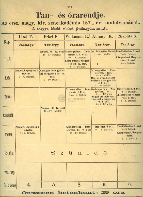 Az országos magyar királyi zeneakadémia tan-és órarendje az 1875/76-os tanévben: Liszt Ferenc zongora-"legmagasb kiművelés"), Erkel Ferenc-zongora és a magyar zene gyakorlata, III-IV. osztály, Volkmann Róbert összhangzattan, zeneszerzés I-II., ellenpont és hangszerelés III-IV. osztály, Ábrányi Kornél zenesztétika II.,összhangzattan és zeneszerzés I. és magyar prozódia II., szépészet II. osztály, Nikolits Sándor zenetörténet I,II,III. és ellenpont és hangszerelés II. osztály számára.