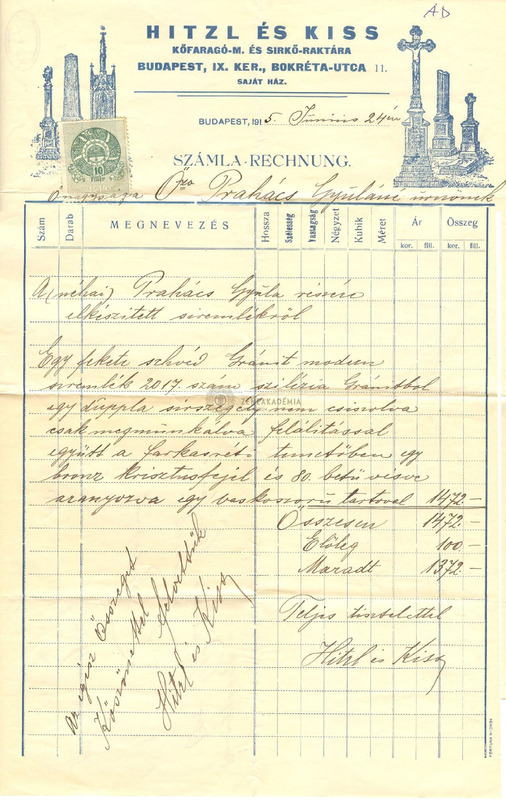 - Számlalevél özvegy Prahács Gyulánénak, a Prahács Gyula részére a Hitzl és Kiss cég által készített síremlékről.