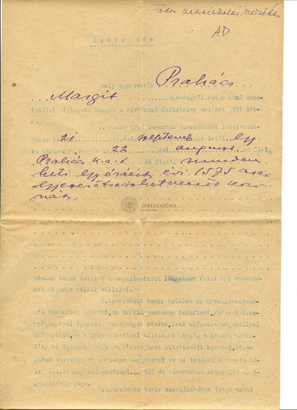 Prahács Margit és Fodor Ernő szerződése arról, hogy utóbbi zeneiskolájába tanárnak szerződteti. A szerződés feltételeinek leírása.