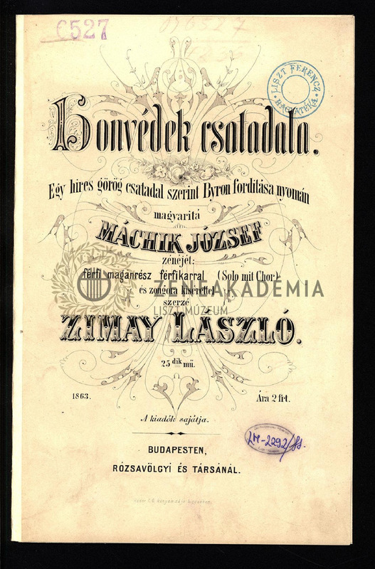 Honvédek csataladala. Férfi magánrész, férfikarral (Solo mit Chor) és zongora kisérettel, 25ik mű. Egy hires görög csatadal szerint Byron forditása nyomán magyaritá Máchik József.
