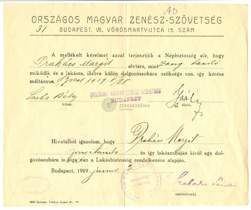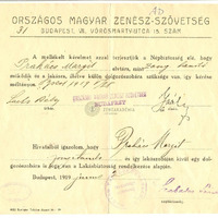 Az Országos Magyar Zenész Szövetség igazolása arról, hogy Prahács Margitnak zongoratanulóként lakószobán kívül egy dolgozószobára is szüksége van a Lakásbiztosság rendelkezése alapján.