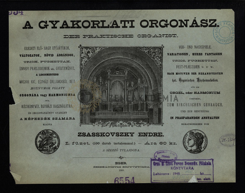 A gyakorlati orgonász.; Eredeti elő- vagy utójátékok, változatok, rövid ábrándok, triók, fughetták, ünnepi praeludiumok stb. gyűjteménye a legismertebb magyar kat. egyházi motívumok felett orgonára vagy harmóniumra, kézikönyvül egyházi használatra és segédtankönyv gyanánt a képezdék számára. I. füzet.