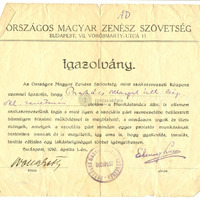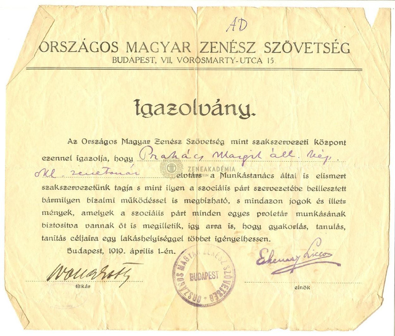 Az Országos Magyar Zenész Szövetség igazolása arról, hogy Prahács Margit zenetanár a szövetség tagjaként szakszervezeti tagnak minősül, így a szociális párt bármely tagját megillető jogokkal élhet, azaz egy lakáshelyiséggel többet igényelhet tanulás és gyakorlás céljából.