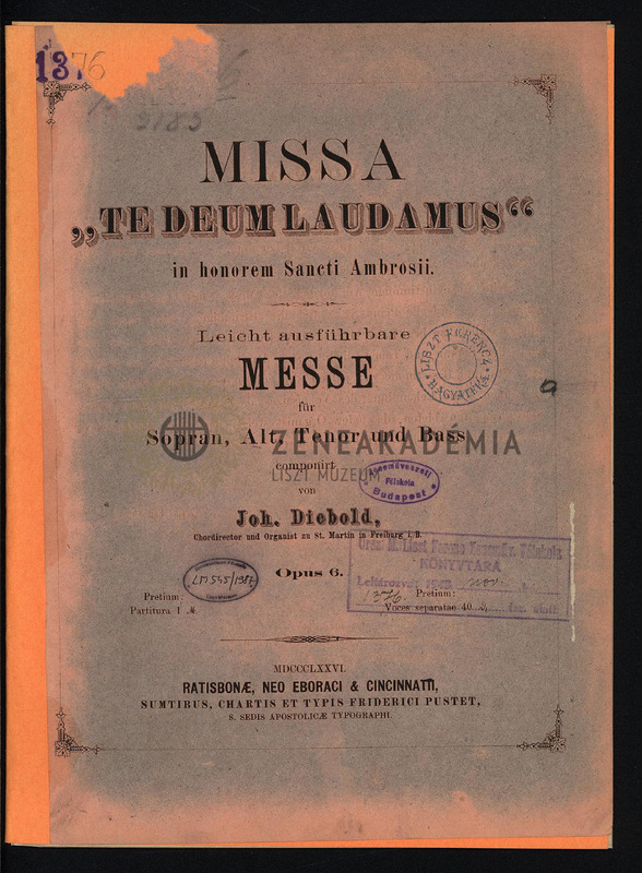 Missa "Te Deum laudamus" in honorem Sancti Ambrosii, Op. 6. Leicht ausführbare Messe für Sopran, Alt, Tenor und Bass.