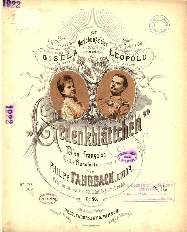 "Gedenkblättchen". Polka française für das Pianoforte. Zur Verlobungsfeier Frau Erzherzogin Gisela von Oesterreich und Prinzen Leopold von Baiern. Op. 86.