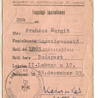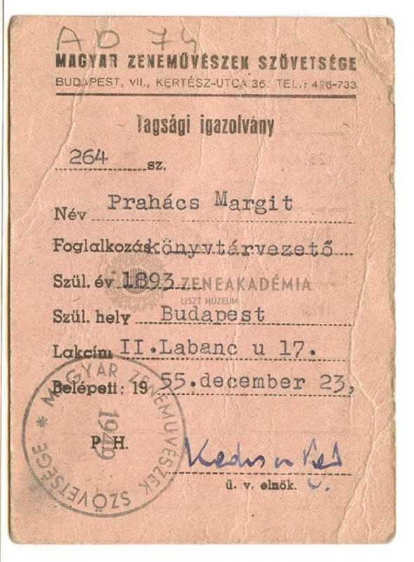 A Magyar Zeneművészek Szövetségének tagsági igazolványa Prahács Margit részére.