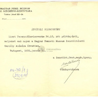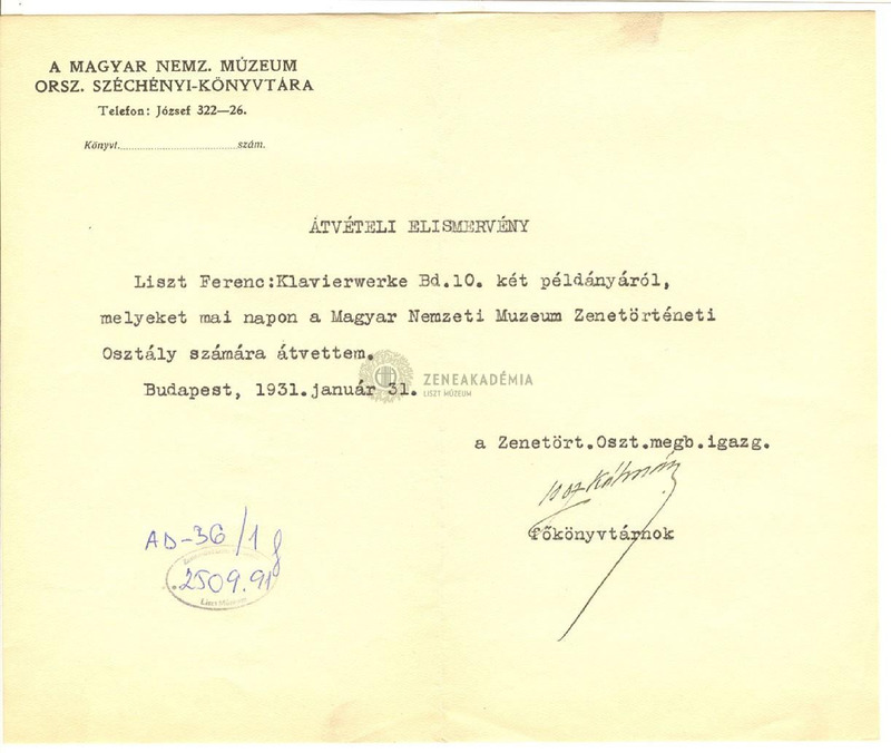 A Magyar Nemzeti Múzeum Zenetörténeti Osztályának elismervénye Liszt: Klavierwerke Bd.10. 2 példányának átvételéről, dr. Isoz Kálmán főkönyvtárnok aláírásával.