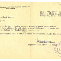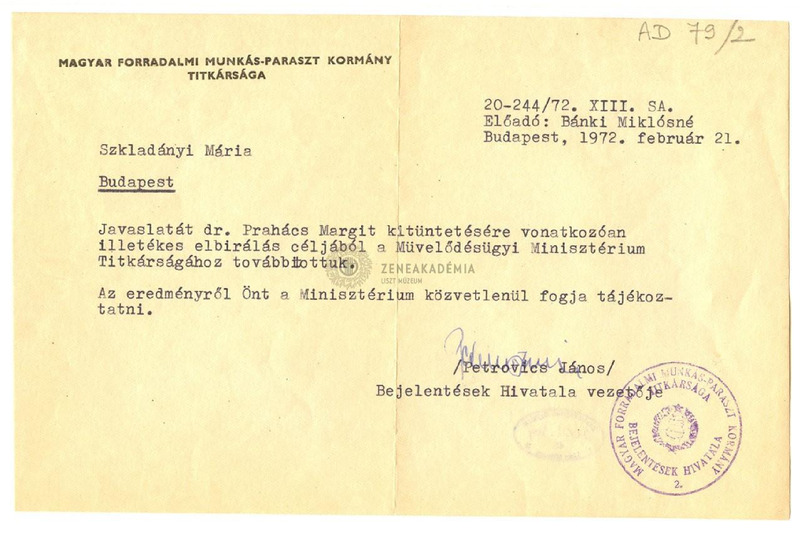 Petrovics János, a Bejelentések Hivatalának vezetőjének levele Szkladányi Máriának arról, hogy a Dr. Prahács Margit kitüntetésére vonatkozó kérelmét a Művelődésügyi Minisztérium Titkárságának továbbította.