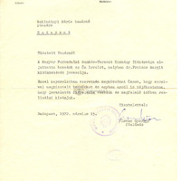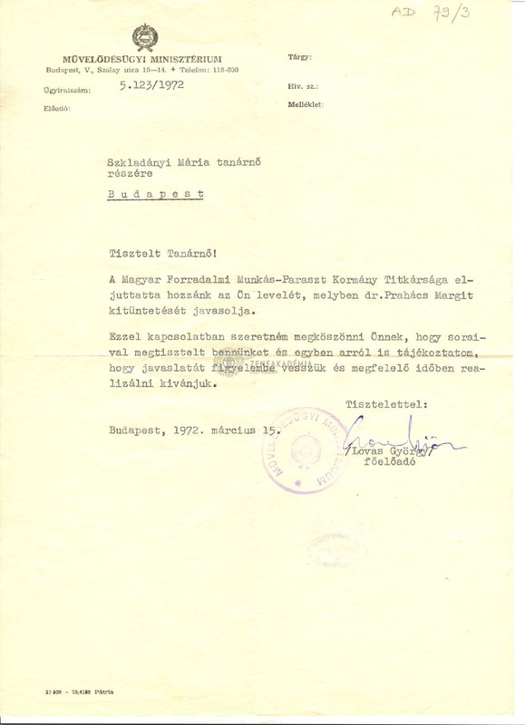 A Művelődésügyi Minisztérium levele Szkladányi Mária tanárnőnek, melyben tudatják, hogy Prahács Margit kitüntetésére vonatkozó javaslatát figyelembe veszik s megfelelő időben realizálni fogják. Lovas György főelőadó aláírásával.