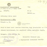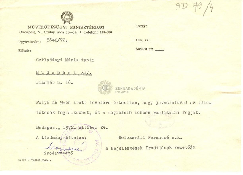 A Művelődésügyi Minisztérium levele Szkladányi Mária tanárnőnek, melyben tudatják, hogy Prahács Margit kitüntetésére vonatkozó javaslatát figyelembe veszik s megfelelő időben realizálni fogják. Kolozsvári Ferencné, a Bejelentések Irodájának vezetője.