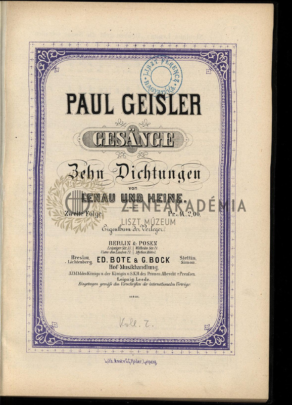 Kolligátum. "Drüben gecht die Sonne scheiden." (Lenau); "Auf geheimem Waldespfade." (Lenau); "Sonnenuntergang" (Lenau); "Auf dem Teich, dem regungslosen." (Lenau); "Der Nachtwind hat in den Bäumen sein Rauschen eingestellt." (Lenau); "Vor Kälte ist die Luft erstarrt." (Lenau); "Du schönes Fischermädchen." (Heine); "Mein Liebchen, wir sassen beisammen." (Heine); "Es fällt ein Stern herunter." (Heine); "Aus den Himmelsaugen droben fallen zitternd goldne Funken." (Heine).