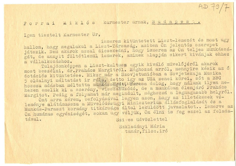 Szkladányi Mária tanár, filozófus, író levele Forrai Miklós karmesternek Prahács Margit kitüntetésének ügyében. Keltezés nincs. Gépelt másolat.