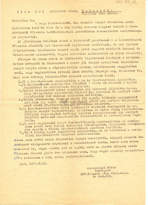 Szkladányi Mária tanár, író levele Ilku Pál miniszter úrnak Prahács Margit kitüntetésének ügyében. Gépelt másolat.