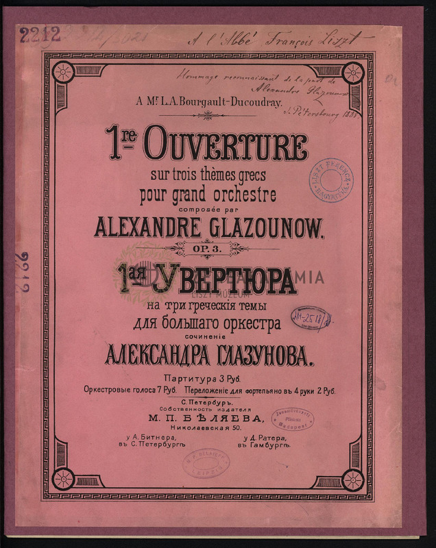Lisztnek szóló kézírásos ajánlással: "? lAbbé François Liszt Hommage reconnaissant de la part de Alexandre Glazunow S. Pétersbourg 1885". A borító és a fejcím kétnyelvű (francia-orosz).