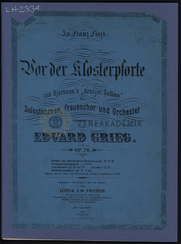 Lisztnek szóló nyomtatott ("An Franz Liszt") és kézírásos ajánlással: "Herrn Dr. Franz Liszt/ in Verehrung / von/ Edvard Grieg".