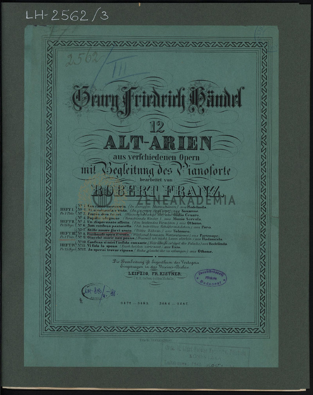 No. 7. Stille amare gia vi sento. /Bittre Zähren/ aus Tolomeo. 8. Furibondo spira il vento. /Wüthend brausen Wetterstürme/ aus Partenope. 9. Giacche morir non posse. /Dieweil ich nicht kann sterben/ aus Radamisto.