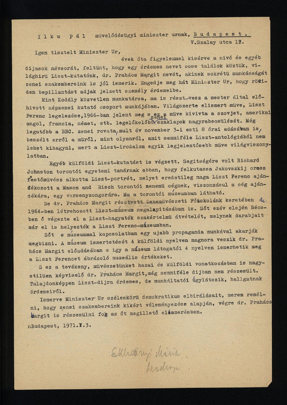 Szkladányi Mária levele Ilku Pál művelődésügyi miniszternek, Prahács Margit munkásságának elismerése érdekében.