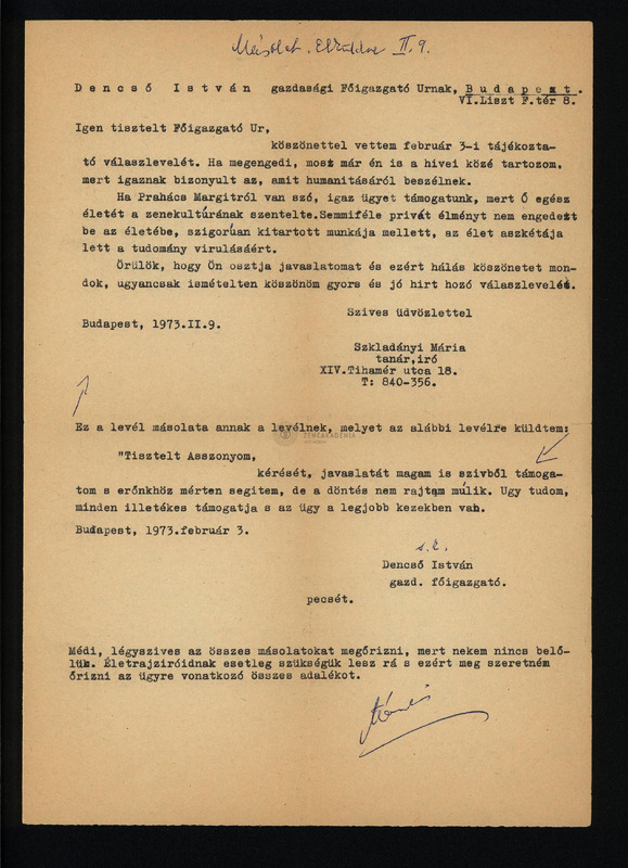 Szkladányi Mária levelének másolata Dencső Istvánnak, a Zeneakadémia gazdasági főigazgatójának, Prahács Mária elismerésének ügyében.
