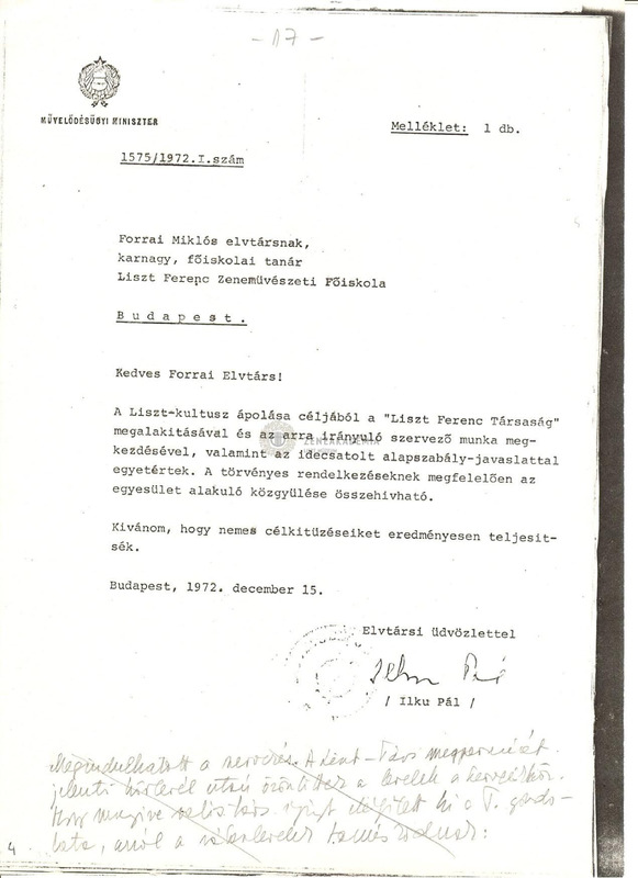 Ilku Pál művelődésügyi miniszter levele Forrai Miklós karnagynak és főiskolai tanárnak, melyben engedélyezi a Liszt Ferenc Társaság megalakulását.