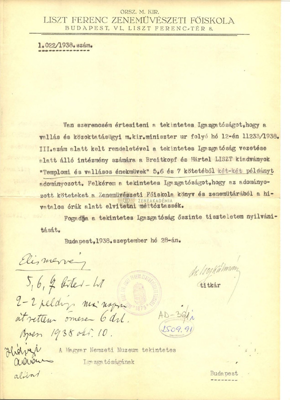 Értesítés a Magyar Nemzeti Múzeumnak a Liszt-összkiadás "Templomi és vallásos énekművek" 5., 6. és 7. kötetének adományozásáról és elismervény azok 2-2 példányban való átvételéről Hídvégi Ádám aláírásával, 1938.10.10-én.