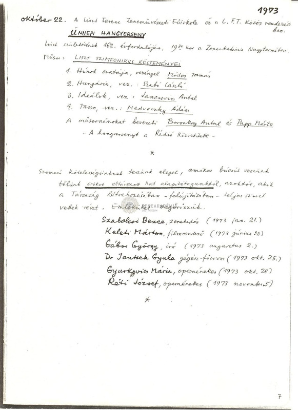 Kézírásos feljegyzés a Zeneművészeti Főiskola és a Liszt Ferenc Társaság közös rendezvényeiről (1973): Alakuló Közgyűlés és Ünnepi Liszt-hangverseny(05.15.),emléktábla-avatás a Régi Zeneakadémián (07.31.),koszorúzás Doborjánban(10.21.), táblaleleplezés a Hét Választó-fejedelem Fogadó épületén és ünnepi hangverseny(10.22.).