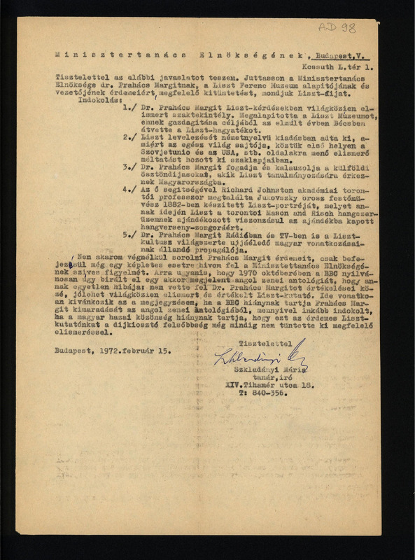 Szkladányi Mária tanár, író beadványa a Minisztertanács Elnökségének dr.Prahács Margit munkásságának elismerése érdekében.