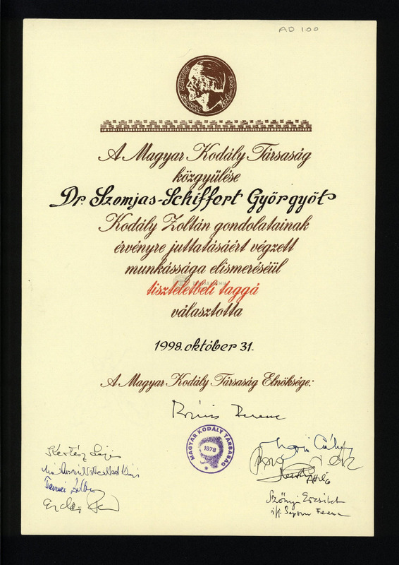 Emléklap Szomjas-Schiffert György tiszteletbeli taggá választásáról a Magyar Kodály Társaságban. Bónis Ferenc és más elnökségi tagok aláírásával.