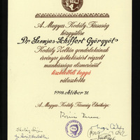 Emléklap Szomjas-Schiffert György tiszteletbeli taggá választásáról.