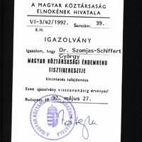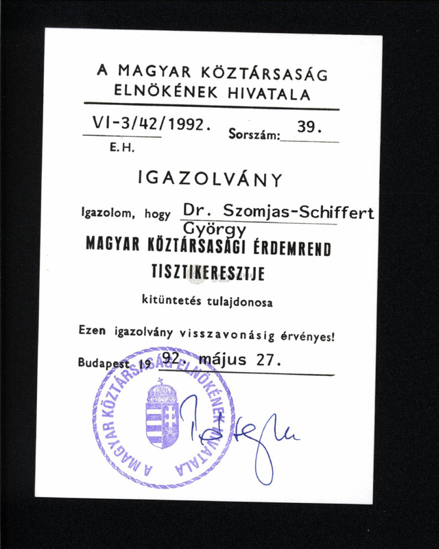 A Magyar Köztársaság Érdemrendjének Tisztikeresztje Szomjas -Schiffert György részére.