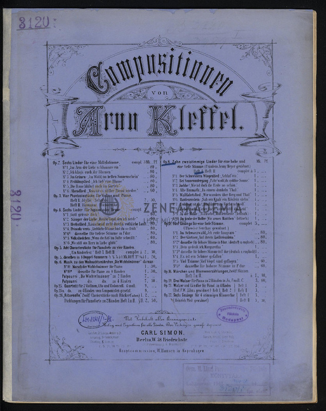 Heft I. No. 1. Der Schwestern Wiegenlied; 2. Bei Sonnenunterang; 3. Juchhe!; 4. Alte Heimath; 5. Wallfahrtslied. Heft II. No. 6. Haidenröslein; 7. Frühling ist da!; 8. Ueber Nacht; 9. In der Mühle; 10. Am Grabe der Mutter.