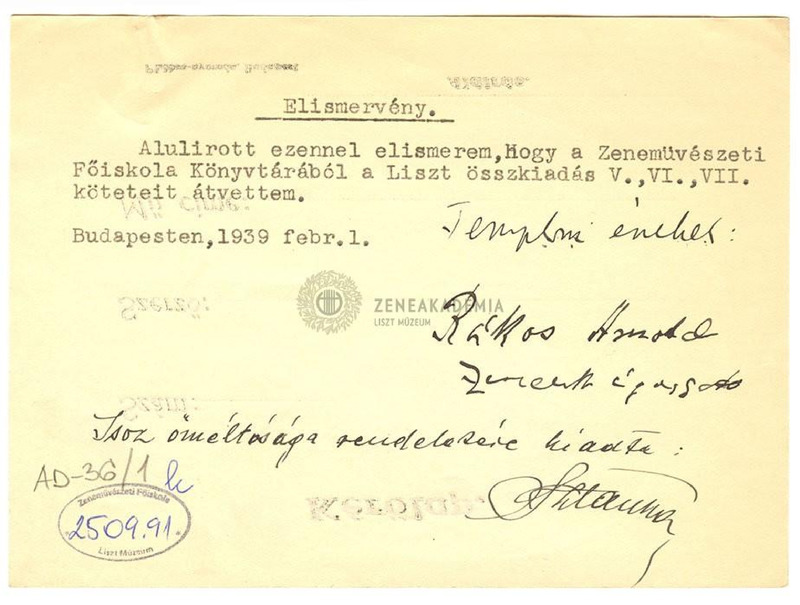 - Rákos Arnold átvételi elismervénye a Liszt-összkiadás 5., 6. és 7. kötetéről.
