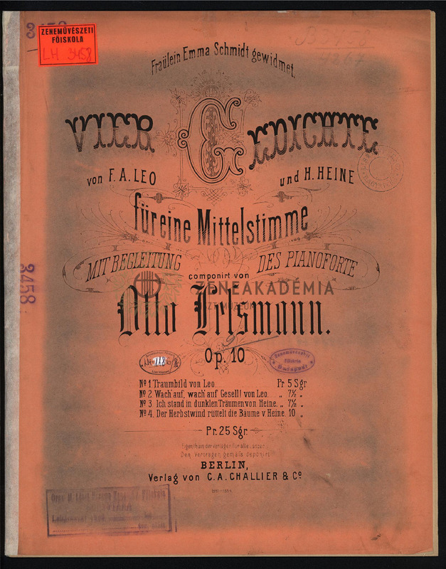 No.1. Traumbild von Leo; No. 2. Wach auf, wach auf Gesell! von Leo; No. 3. Ich stand in dunklen Traumen von Heine; No. 4. Der Herbstwind rüttelt die Bäume v. Heine.