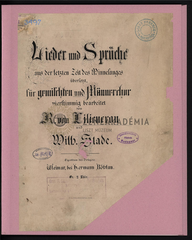 Lieder und Sprüche aus der letzten Zeit des Minnesanges übersetzt, für gemischten und Männerchor vierstimmig bearbeitet; von R. von Liliencron; Wilh. Stade.