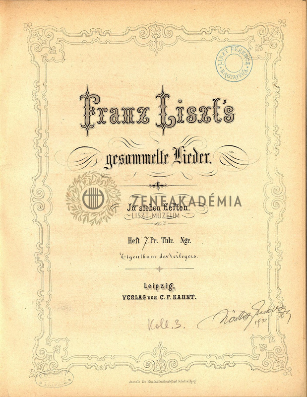 Nonnenwerth für Bariton und Klavier. 2. Fassung, Ra 618b, LW N6b;Wieder möcht ich dir begegnen für Singstimme und Klavier, Ra 614, LW N60;Blume und Duft für Singstimme und Klavier, Ra 616, LW N50;Ich liebe dich für Singstimme und Klavier, Ra 617, LW N52;Die stille Wasserrose für Singstimme und Klavier, Ra 613, LW N59;Wer nie sein Brot mit Tränen ass für Bariton oder Alt und Klavier. 2. Vertonung, Ra 609b, LW N34b;Ich scheide für Singstimme und Klavier, Ra 611, LW N58;Die drei Zigeuner für Singstimme und Klavier, Ra 612, LW N62. A 7. füzetben a 34. oldal fejjel lefelé nyomtatva. A címlapon tintás feljegyzés: "Rösler Endre 1932". Kolligátum.