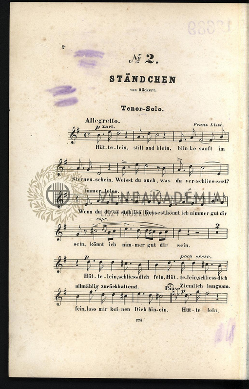 Borító nélkül. A 2 partitúra egyike nem Liszt hagyatékából származik; a Pesti Nemzeti Dalkör példánya volt. Hátsó borítóján Ábrányi Emil magyar fordítása ráragasztva, ugyanez a szöveg a kottába beírva.