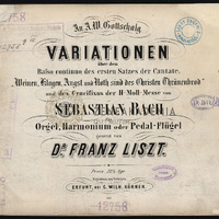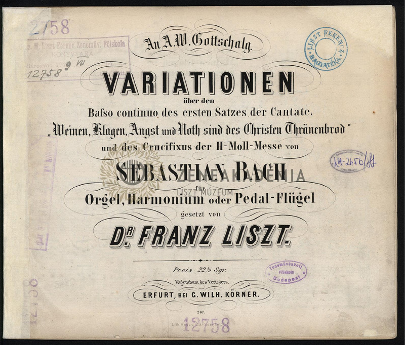 Variationen über den Basso continuo des ersten Satzes der Cantate: "Weinen, Klangen, Angst und Noth sind des Christen Thränenbrod" und des Crucifixus der h-moll Messe von Sebastian Bach für Orgel, Harmonium oder Pedal-Flügel.