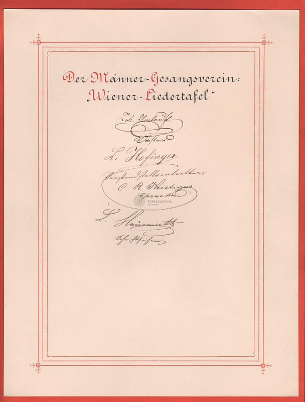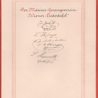 "Der Männer-Gesangsverein: Wiener-Liedertafel" ( A Bécsi Dalárda Férfikar Egyesület) köszöntőlapja aláírásokkal.