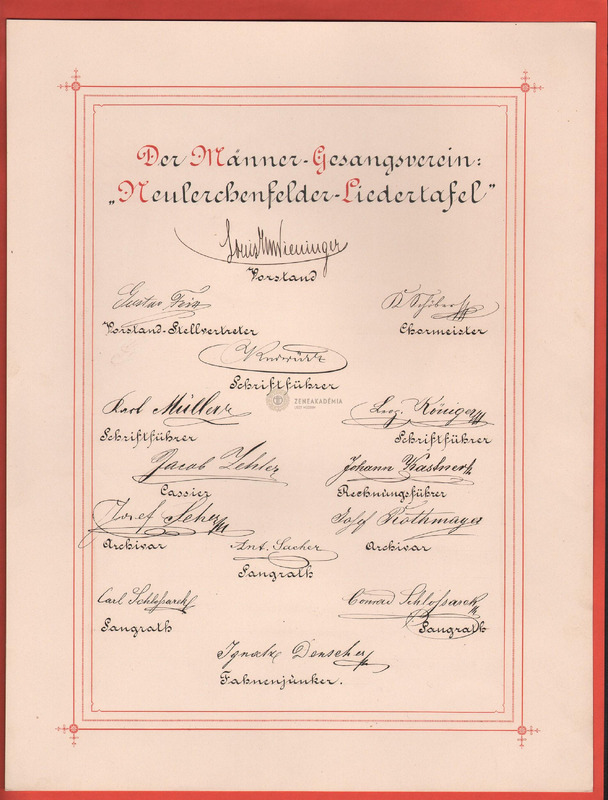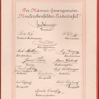"Der Männer-Gesangsverein: Neulerchenfelder-Liedertafel" ( A Neulerchenfelder-Liedertafel Férfikar Egyesület) köszöntőlapja aláírásokkal.