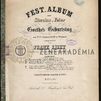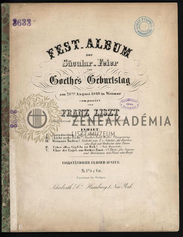 Fest-Album zur Säcular-Feier von Goethes Geburtstag am 28ten August 1849 in Weimar. I. Introduction. Fest-Marsch. II. "Licht, mehr Licht" /Goethes letzte Worte/: Chorgesang. III. Weimars Todten! Gedicht von F. v. Schober für Bariton oder Bass mit Orchester oder Piano. IV. Ueber allen Gipfeln ist Ruh! /Solo-Quartett/. V. Chor der Engel aus Göthes Faust. (2ter Theil) für Sopran und Altstimmen, [Tenöre und Bässe] mit Piano oder Harfe. Vollständiger Clavier-Auszug.