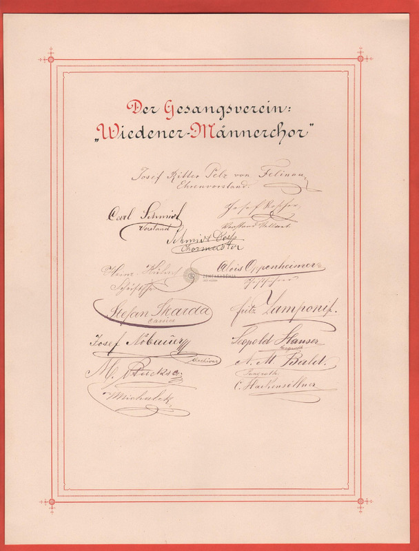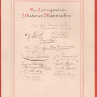 "Der Gesangsverein: Wiedener-Männerchor " ( A Wiedeni Férfikar Énekegyesület) köszöntőlapja aláírásokkal.