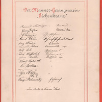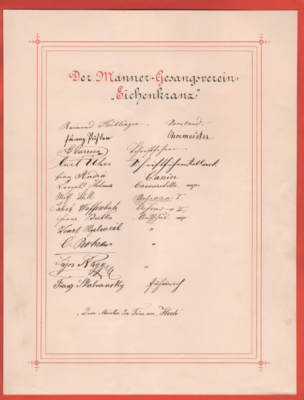 "Der Männer-Gesangsverein: Eichenkranz" ( A "Tölgykoszorú" Férfikar Egyesület) köszöntőlapja aláírásokkal.