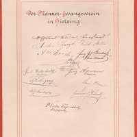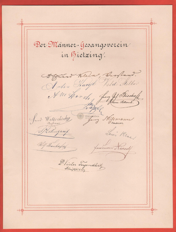"Der Männer Gesangsverein in Hietzing" ( A Hietzingi Férfikar Egyesület) köszöntőlapja aláírásokkal.