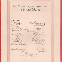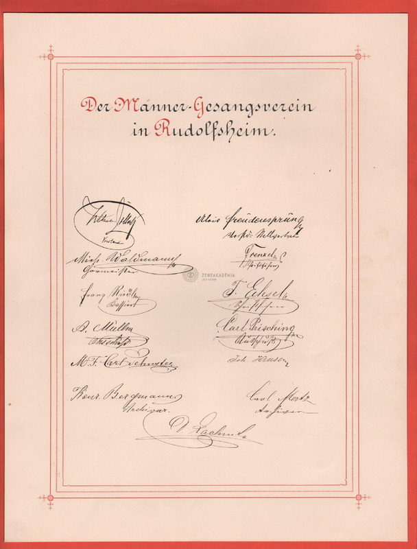 "Der Männer-Gesangsverein in Rudolfsheim" (A Rudolfsheim Férfikar Egyesület) köszöntőlapja aláírásokkal.