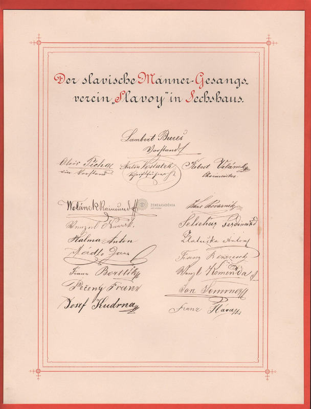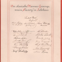 "Der slavische Männer-Gesangsverein "Slavoy" in Sechshaus" ( A Sechshausi "Slavoy" Szláv Férfikar Egyesület) köszöntőlapja aláírásokkal.