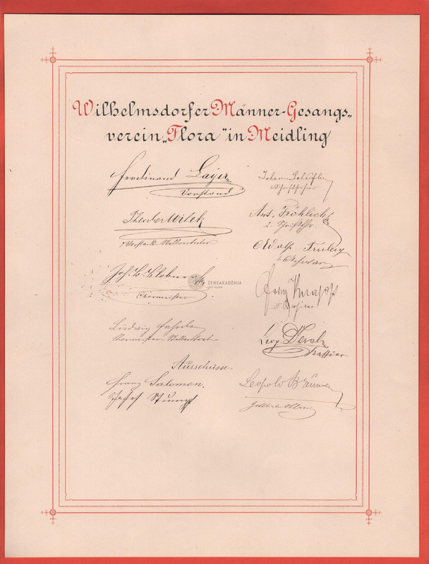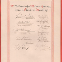 "Wilhelmsdorfer Männer-Gesangsverein "Flora" in Meidling " (A Meidlingi "Flora" Wilhelmsdorfi Férfikar Egyesület) köszöntőlapja aláírásokkal.