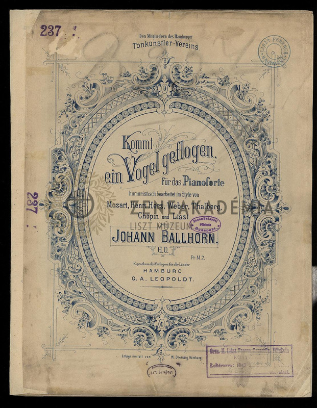"Kommt ein Vogel geflogen". Für das Pianoforte humoristisch bearbeitet im Style von Mozart, Henri Herz. Weber, Thalberg, Chopin und Liszt von Johann Ballhorn.
