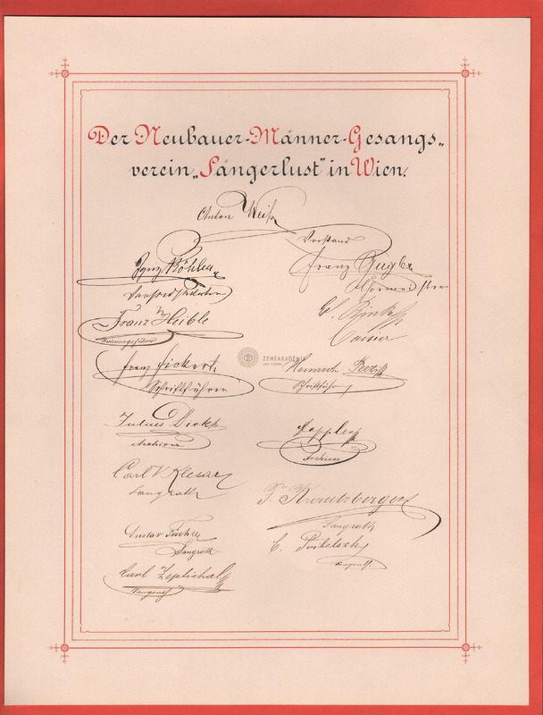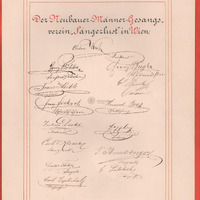 "Der Neubauer-Männer-Gesangsverein "Sangerlust" in Wien" ( A Neubaueri "Sangerlust" Férfikar Egyesület" köszöntőlapja aláírásokkal.