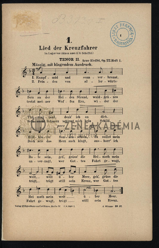 - Heft 1. No. 1. Lied der Kreuzfahrer; No. 2. Des Glasers Töchterlein; No. 3. An dir Nacht; Heft 2. No. 4. Morgenruf; No. 5. Feuerher; No. 6. Ständchen. Mindkét füzet partitúrája 2 példányban, az 1. füzeté eltérő jelzetekkel.
