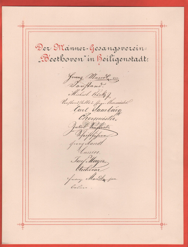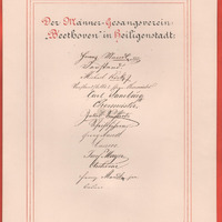 "Der Männer-Gesangsverein "Beethoven" in Heiligenstadt" (A Heiligenstadti "Beethoven" Férfikar Egyesület) köszöntőlapja aláírásokkal.