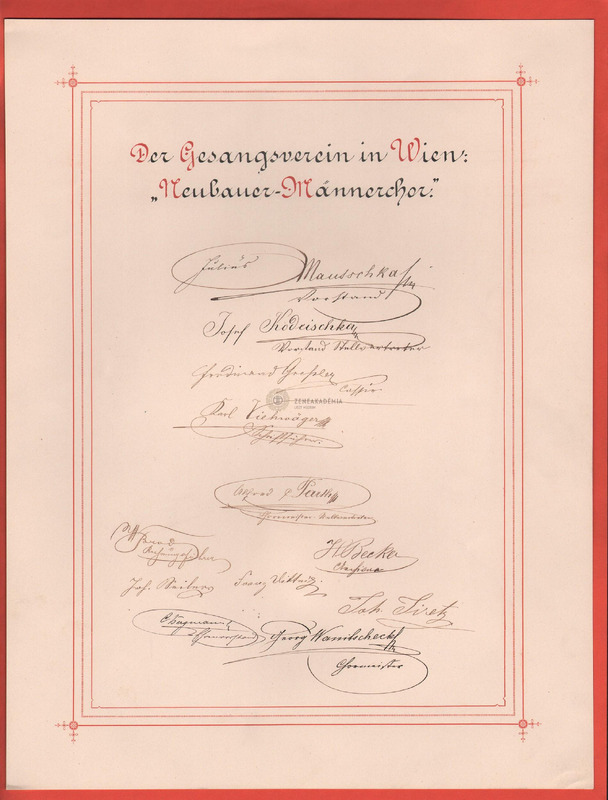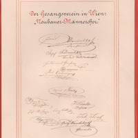 "Der Gesangsverein in Wien: "Neubauer- Männerchor""( A Bécsi Neubauer Férfikórus Énekegyesülete) köszöntőlapja aláírásokkal.